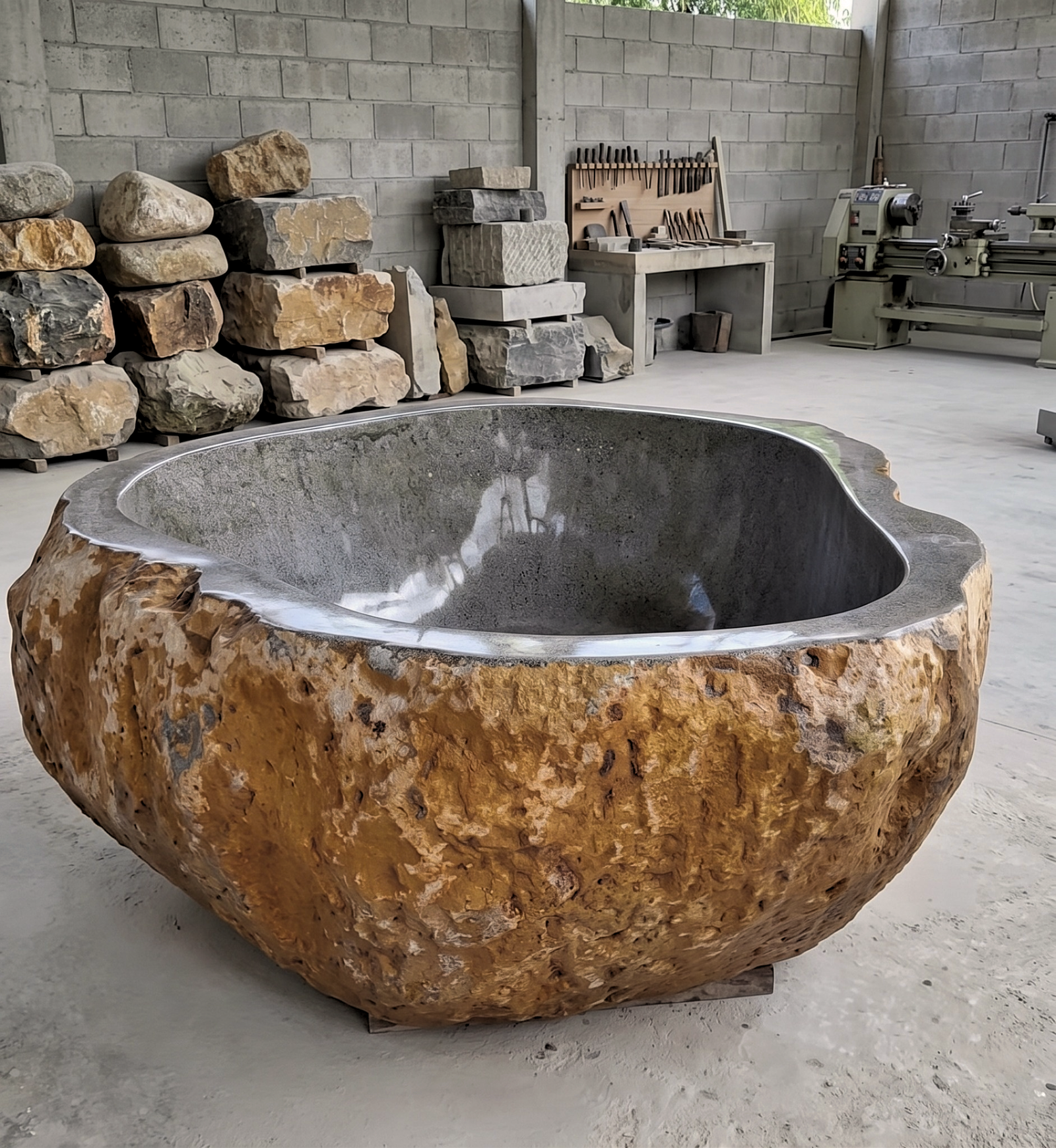 A Sanctuary of Stone. Our most ambitious piece yet. This Massive Natural River Stone Bathtub is hand-carved from a single, colossal boulder. Featuring a wider, more rounded silhouette, this tub is designed not just as a bath, but as a permanent landmark of luxury and nature in your home.