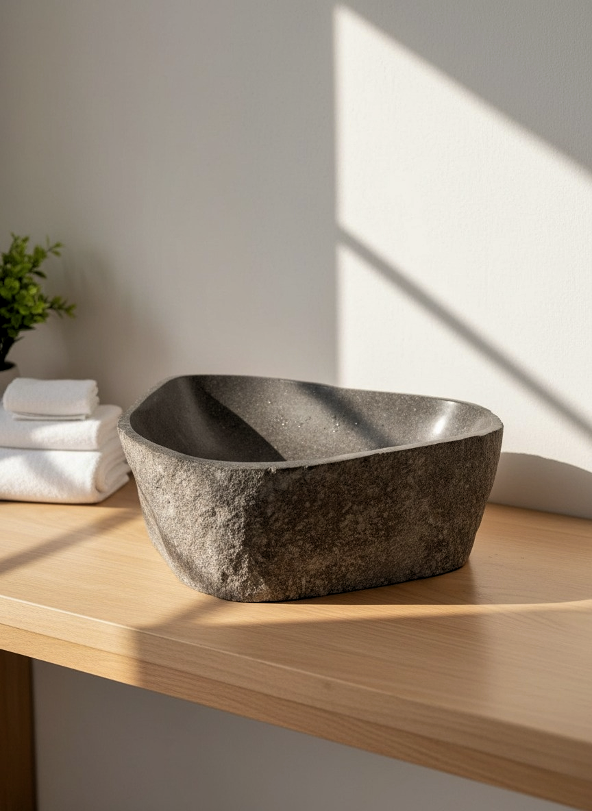 Discover our exquisite natural river stone sinks, meticulously hand-carved and polished by master artisans from Indonesia. Each sink is unique, showcasing the natural variations of river stone, making every piece one-of-a-kind.