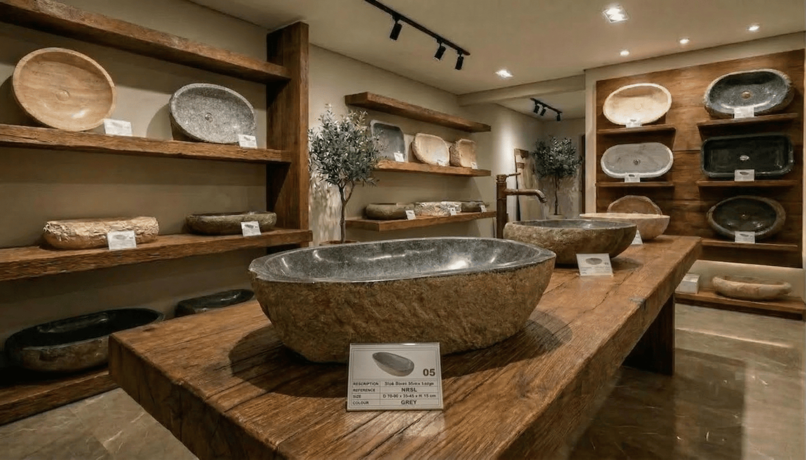 Experience the beauty of nature with our handcrafted double basins, carved from Indonesian river stone.