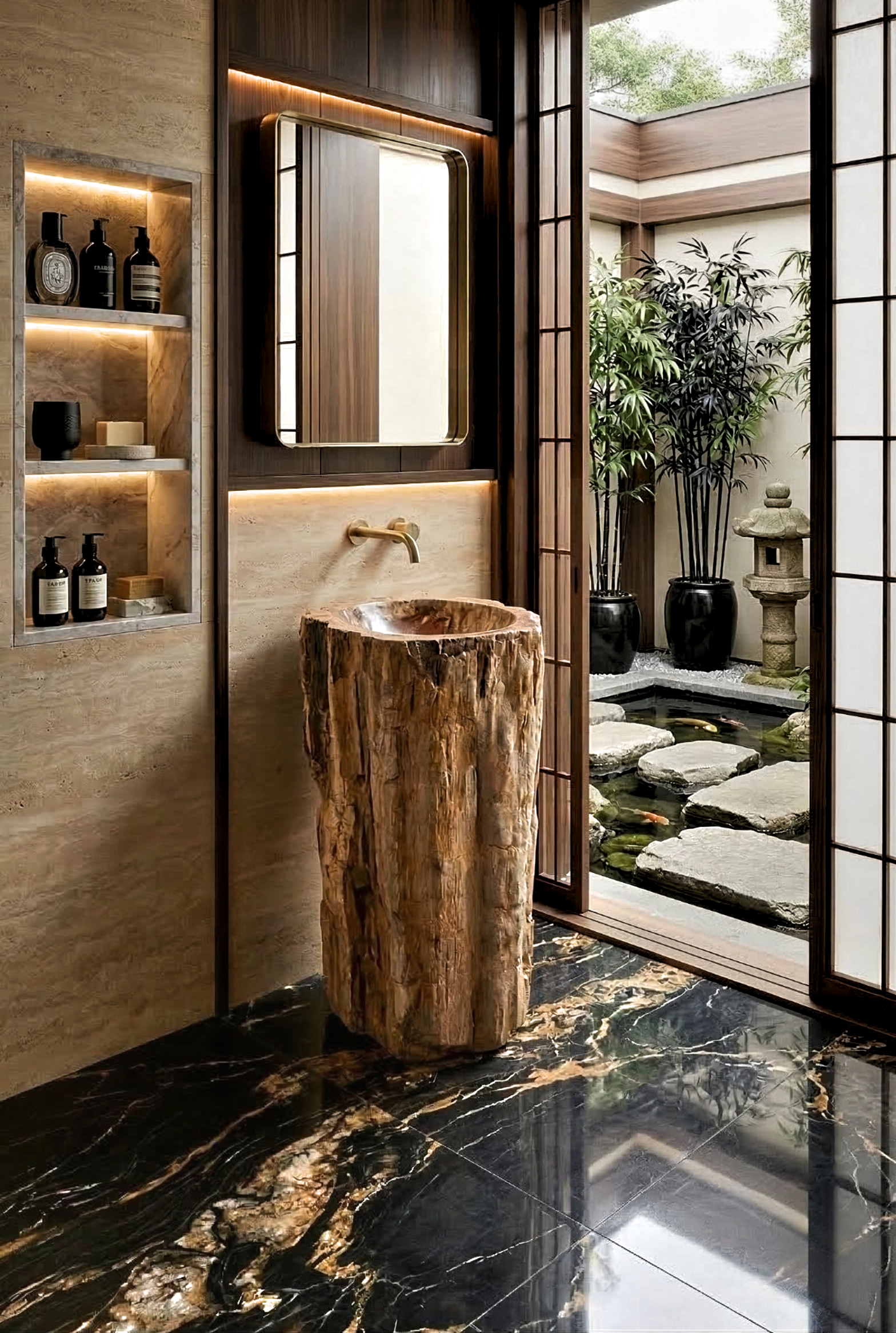 Experience the unique beauty of petrified wood basins. These handcrafted artworks, once wood, have fossilized over millennia, retaining their form while transforming into stone.