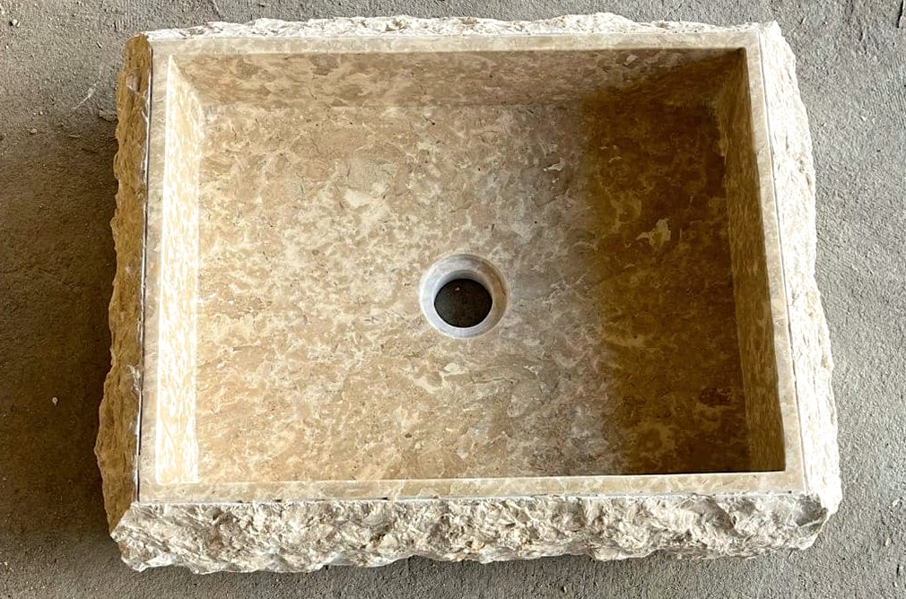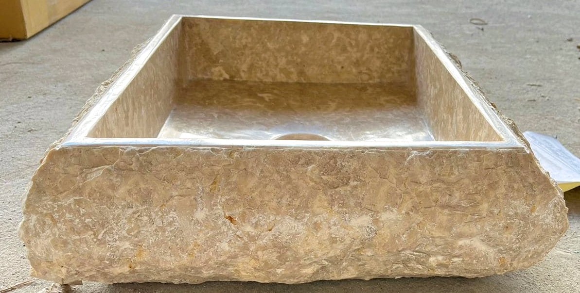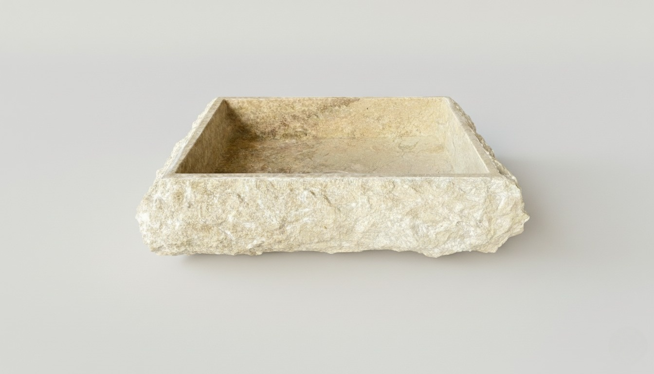 Elevate your space with the unique, grounded elegance of the Sink Kotak Marmo vessel sink. Meticulously hand-carved from beautiful natural cream stone (Marmo) by skilled artisans in Indonesia, this piece is a testament to the raw beauty of stone and refined craftsmanship.